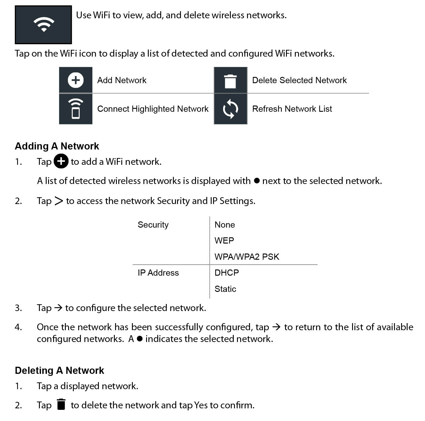 IMPORTANT: If no WiFi connection has been made, follow the “Adding a Network” procedure described in the WiFi settings section above (first topic).
